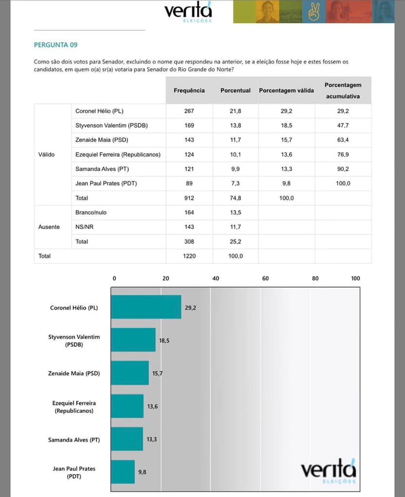A pesquisa do Instituto Veritá mostra um cenário competitivo para o Senado no Rio Grande do Norte e aponta Styvenson Valentim e Coronel Hélio, a dupla da direita, como os dois nomes mais bem posicionados na consolidação dos dois votos. O senador que busca a reeleição, Styvenson Valentim, consolida 25,00% na média dos dois votos e o pré-candidato do PL, Coronel Hélio, aparece com 15,3%. Na sequência aparecem Samanda Alves (PT) com 12,5%, Zenaide Maia com 10,4%, Jean Paul Prates com 9,1%, Ezequiel Ferreira com 5,8%, branco/nulo 10,5% e NS/NR 11,4%.