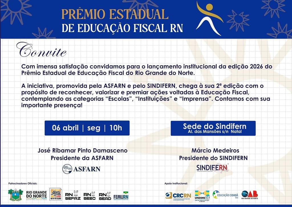 Realizado pelo Sindicato dos Auditores Fiscais do RN (SINDIFERN) e pela Associação dos Auditores Fiscais do RN (ASFARN), o prêmio chega em 2026 com uma importante novidade: a criação da categoria Imprensa, que irá reconhecer e premiar as melhores reportagens sobre educação fiscal produzidas no estado.
