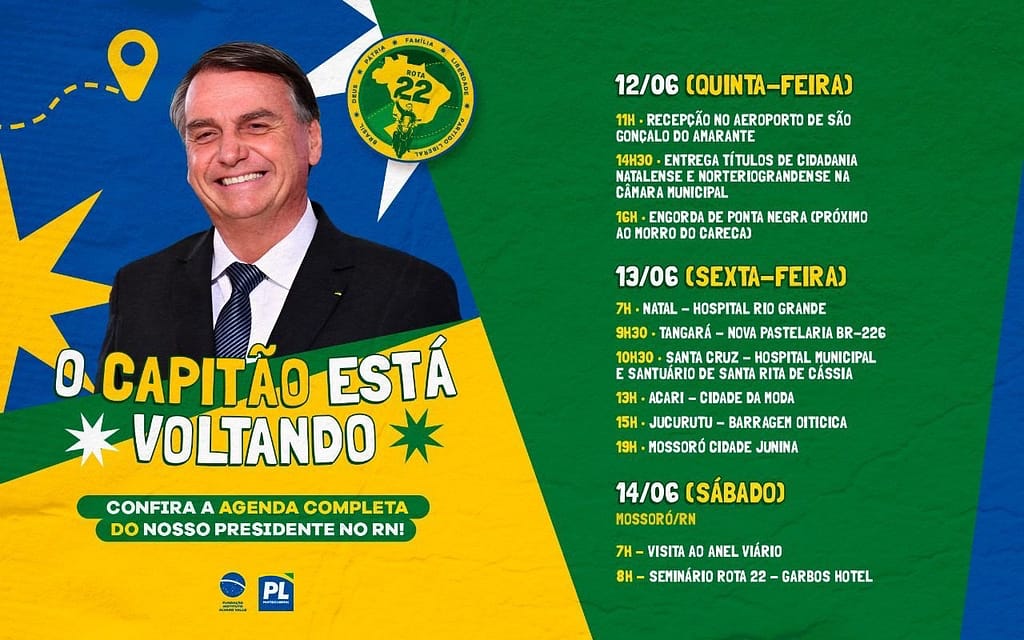 O ex-presidente Jair Bolsonaro (PL-RJ) voltará ao Rio Grande do Norte entre os dias 12, 13 e 14 de junho. Na programação, o maior líder popular do país agradecerá aos profissionais de saúde que lhe atenderam no Estado e participará do projeto Rota 22, em Seminário que será realizado em Mossoró, região Oeste.