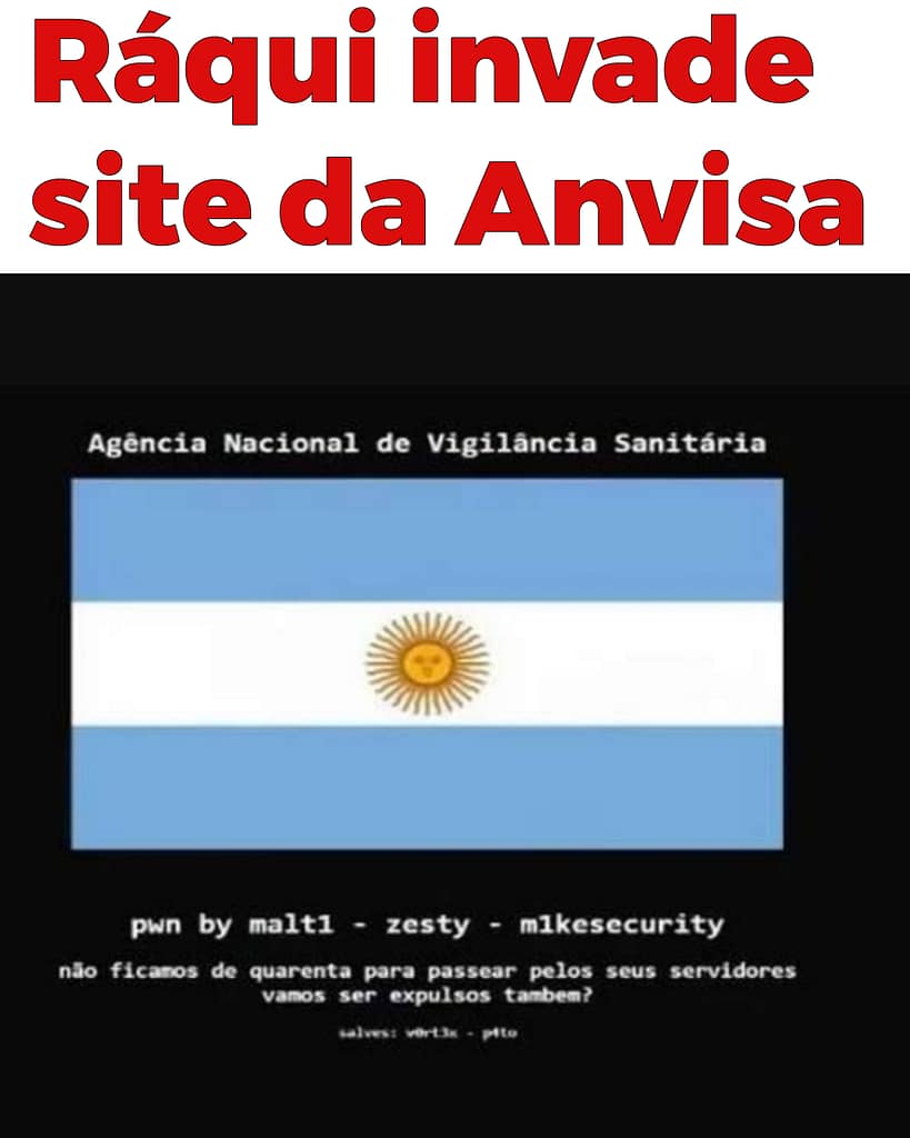 Hackers invadiram o site oficial da Agência Nacional de Vigilância Sanitária (Anvisa) e retiraram o formulário de Declaração de Saúde do Viajante do ar. Eles o substituíram pela bandeira da Argentina, em ato de retaliação à suspensão da partida de futebol entre Brasil e Argentina no último domingo (5).