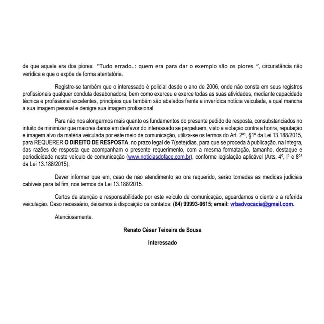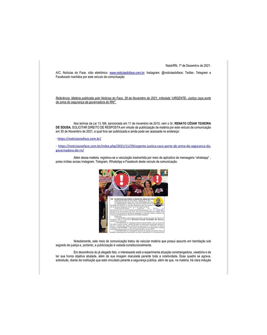 Na data de 30 de novembro de 2021, esta mídia comunicativa intitulada “Notícias do Face”, expôs e distorceu fatos relacionados a procedimento que tramita em segredo de justiça, identificando nominalmente a pessoa de Renato César Teixeira de Sousa.