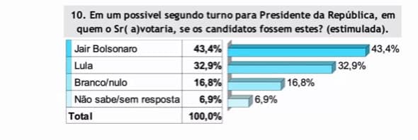 No levantamento do segundo turno, o presidente Bolsonaro teria 43,4% contra 32,9% do petista Lula. Brancos e nulos são 16,8% e não sabe/indeciso, 6,9%.