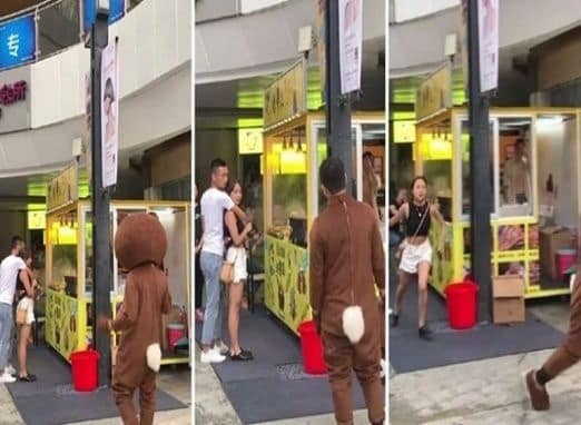 O plano era pegá-la de surpresa, já que estava comemorando aniversário com amigos. Então, o rapaz se fantasiou de urso de pelúcia gigante e foi ao seu encontro.