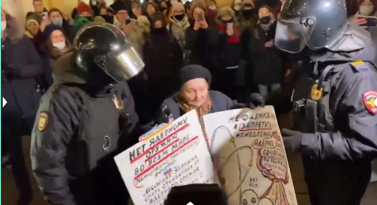 Imagens que estão sendo compartilhadas por opositores à guerra no mundo inteiro mostram policiais de São Petersburgo, uma das maiores cidades russas, prendendo a ativista Yelena Osipova, de 77 anos, que carregava cartazes condenando a ameaça de guerra nuclear feita pelo governo de Vladimir Putin.