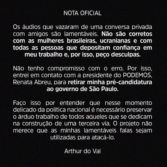 “Se eu vou continuar pré-candidato? Não sei, cheguei agora no Brasil. Eu não quero atrapalhar a terceira via, eu não quero atrapalhar meu partido, eu não quero atrapalhar ninguém. Então, se isso for melhor, tudo bem, eu retiro, não tem problema. Eu só quero que as pessoas me julguem pelo que eu fiz, não pelo que eu não fiz”, disse ele em um vídeo publicado no Youtube.
