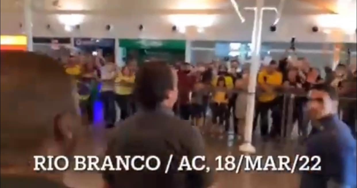 E ao chegar no Aeroporto de Rio Branco, capital do estado, Bolsonaro foi recebido com festa por apoiadores.