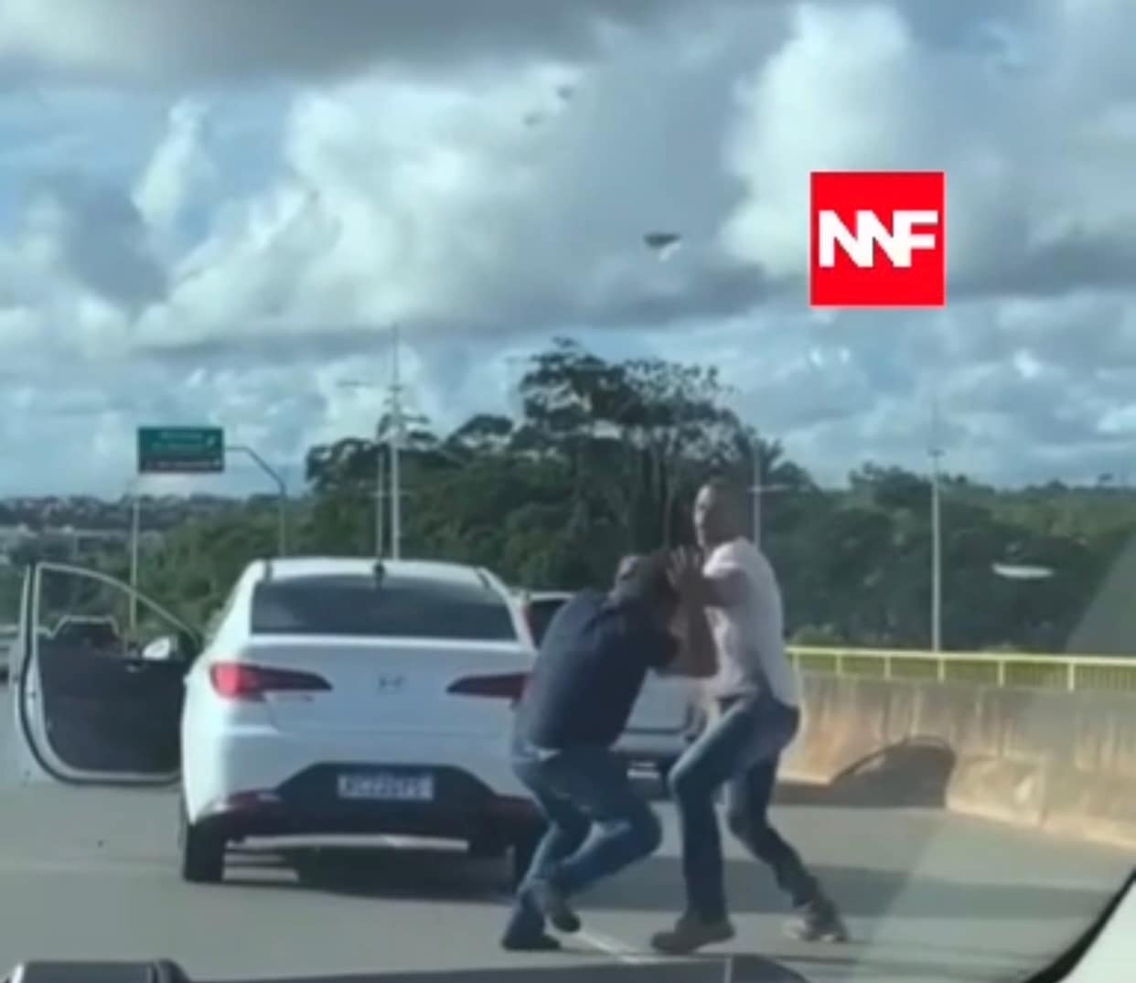Vídeo obtido com exclusividade mostra a dupla em posição de luta, avançando um contra o outro, enquanto seus carros, um deles de portas abertas, permanecem no asfalto atrapalhando o trânsito.