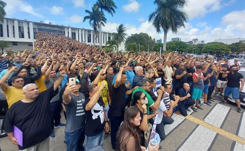 Desde a manhã desta terça, policiais fazem um protesto em frente ao Centro Administrativo para cobrar melhorias salariais. A categoria, que tem os menores salários da segurança pública, cobra uma equiparação com a Polícia Civil e demais forças. Via 98FM