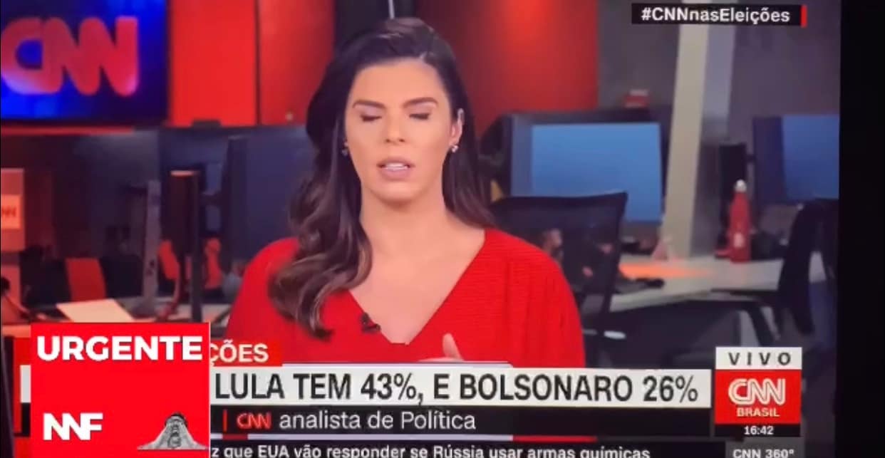 Claramente desconfortável a apresentadora Daniela Lima vendo os resultados já tratou de mudar de assunto. O fato é que na última pesquisa do instituto de esquerda DataFolha dava uma diferença de Lula contra Bolsonaro de 15% e hoje essa diferença è apenas de 8%.