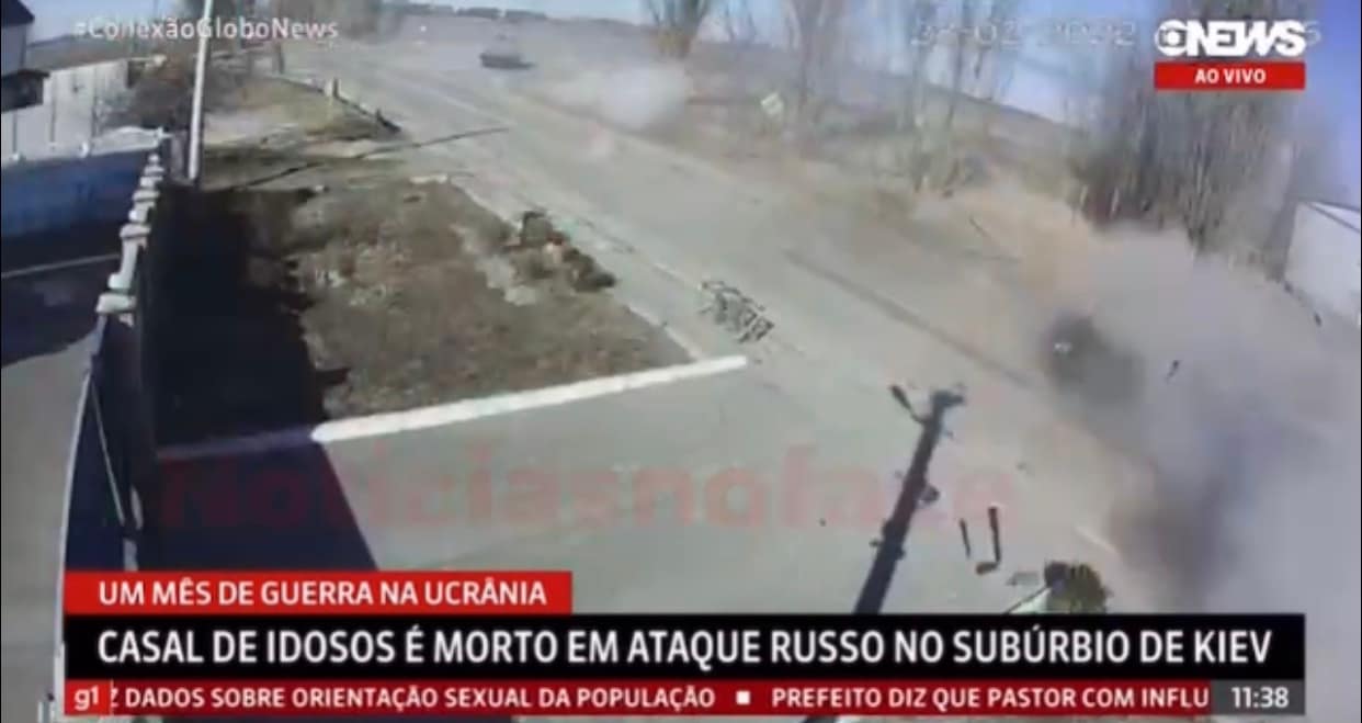 No vídeo é possível ver o momento em que o veículo trafega pela rua. O blindado russo realiza disparos na direção do carro, que para no meio da via, até ser alvejado.