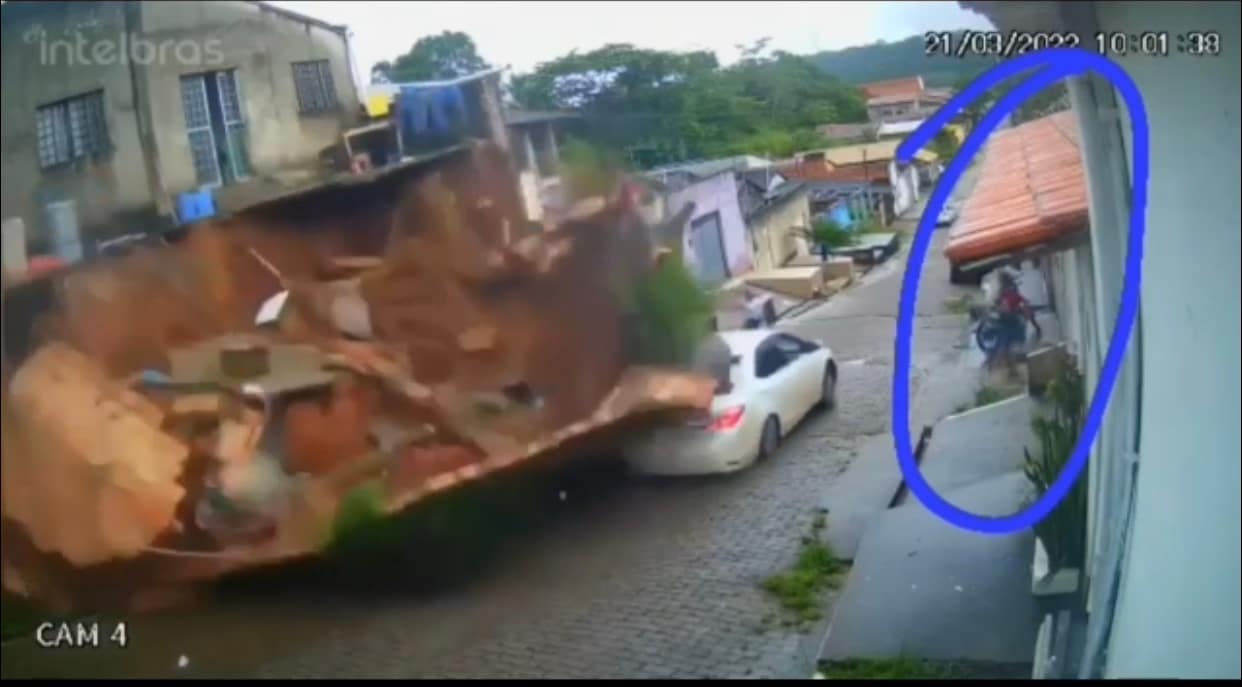 Nas imagens é possível que uma mulher subia a rua a pé e outra, seguia na mesma direção, no outro lado da rua. Assim que o carro virou a esquina e começou a descer a via, o muro cai. Parte dos tijolos e da terra ficaram pela rua.