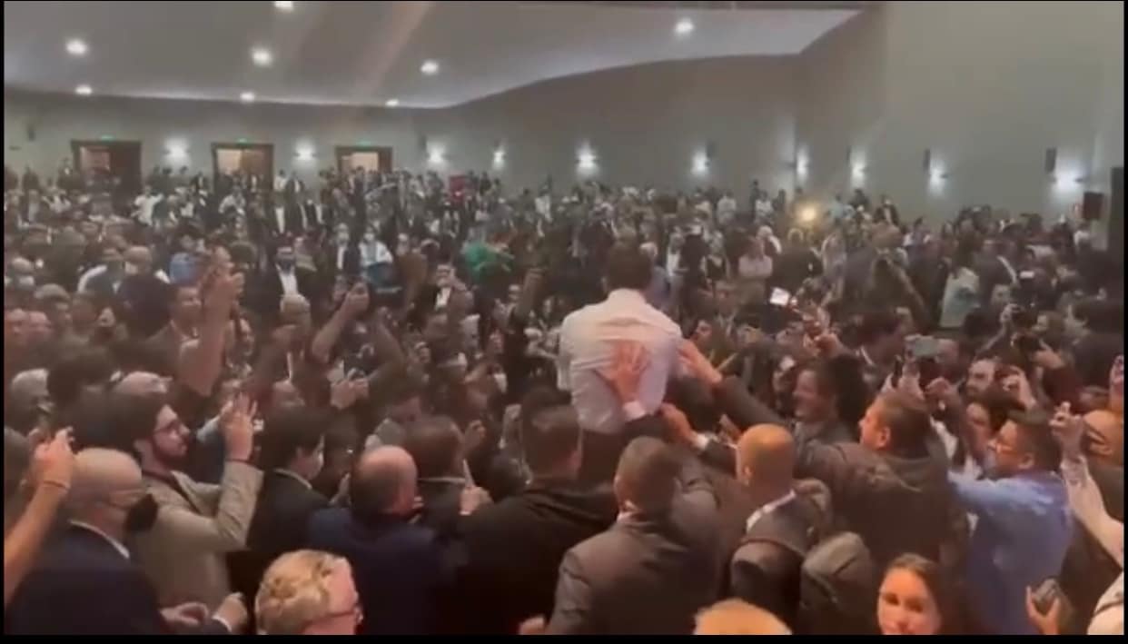 Foi na sua saída, após fim do anúncio a candidatura, seus assessores contrataram dois homens para que no momento exato e combinado, eles pegasse e erguesse Dória colocando nos ombros e saísse perambulando no auditório.