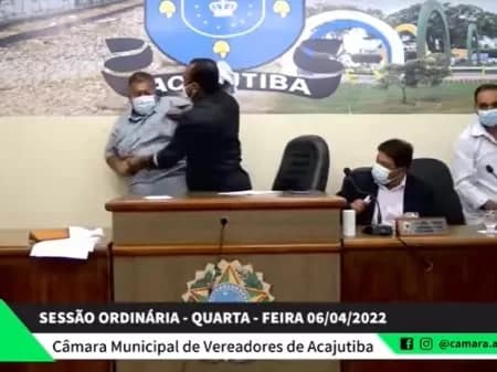 Quando o vídeo volta a focar no presidente da Câmara, o vereador Dias está gritando e gesticulando ao seu lado. Um terceiro homem pega o microfone de Neres e o arremessa.
