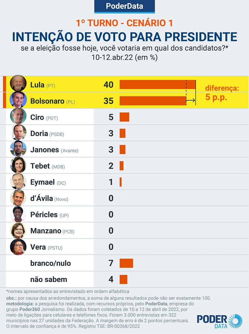 Pesquisa Poder Data 360 coloca Bolsonaro a 5% de Lula. Essa margem chegou a ser 16% em novembro de 2021.