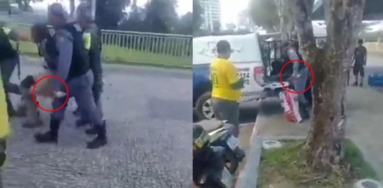 Nas imagens é possível ver o homem sendo levado por quatro policiais militares até uma viatura.