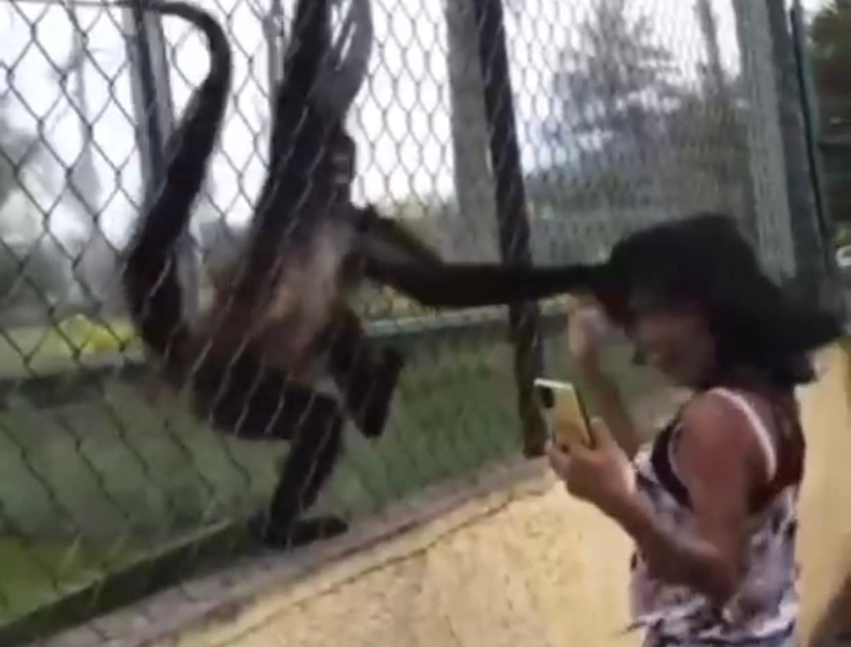 Enquanto segura um celular, a menina incomoda o macaco, que fica claramente irritado com a perturbação. O animal, então, agarra a criança pelos cabelos. Nas imagens, é nítida a força que o bicho puxa os cabelos da garota, que teve sorte de sair sem ferimentos e com o couro cabeludo intacto.
