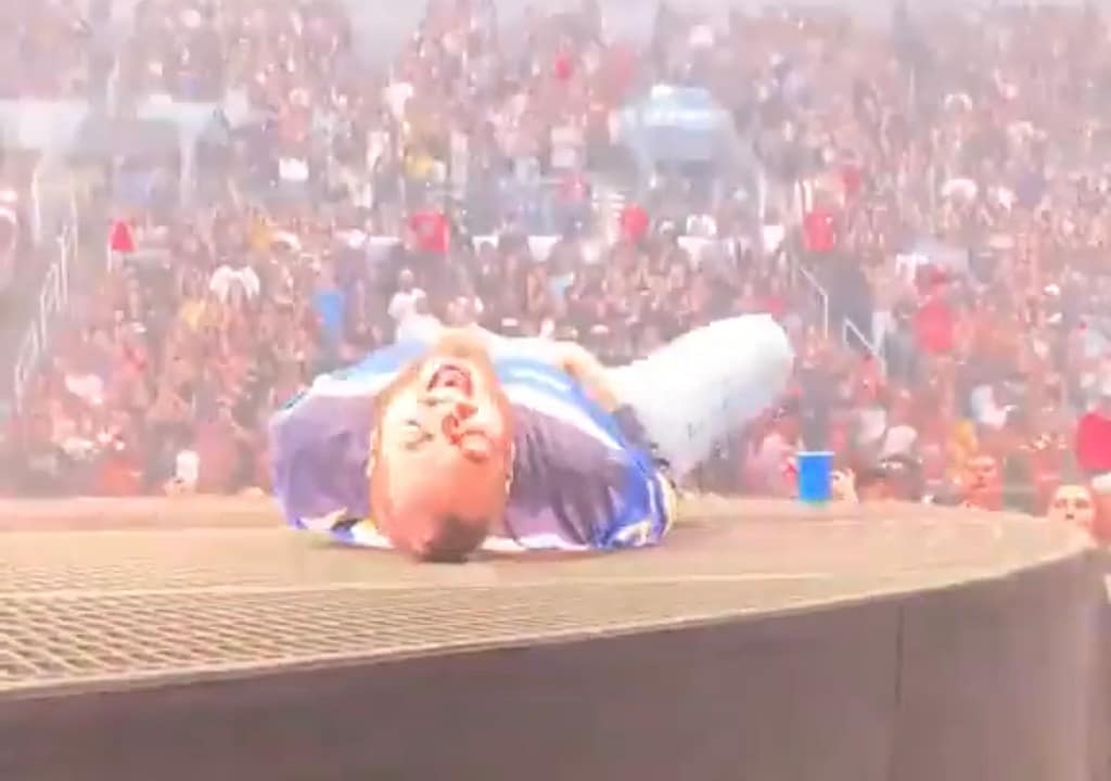 “Tem esse buraco gigante, então eu tentei dar a volta, virei no canto e arrebentei meu traseiro. Me tirou o ar de jeito. Me pegou de jeito”, disse o cantor, que pediu desculpas ao público. “Obrigado pela paciência. Obrigado por aguentarem meu traseiro burro.”