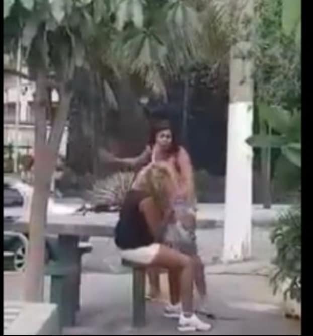 Nas imagens é possível ver a mulher sentada em um banco quando é surpreendida com um puxão de cabelo e começa a apanhar.