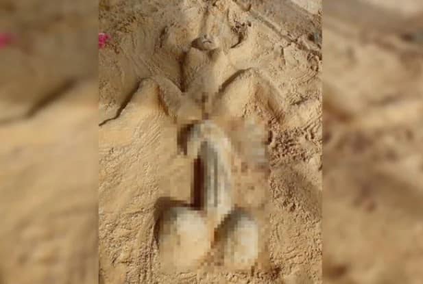 A escultura retrata um órgão genital masculino apontando para o de uma mulher, que está deitada. O autor da “obra de arte” seria um menino, segundo o síndico do condomínio.