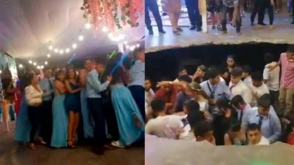 Todos os formandos estavam concentrados em uma parte do piso, quando começaram a comemorar o momento, o chão veio abaixo e todos caíram no enorme buraco que se formou.