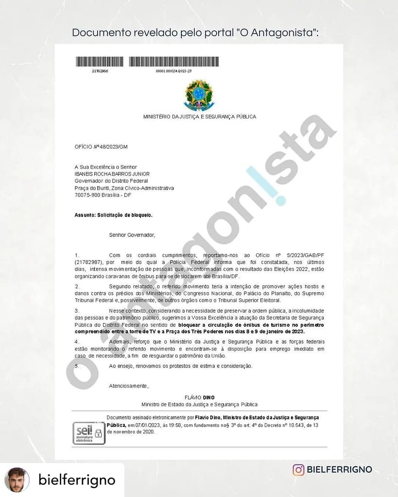Poucas horas depois, o portal ‘O Antagonista’ revelou o documento oficial confirmando que o ministro Flávio Dino sabia da possibilidade de depredação dos prédios dos Três Poderes em Brasília.
