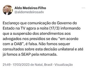 Reagindo ao absurdo, o presidente da Ordem dos Advogados do Brasil no RN acaba de se pronunciar no Twitter desmentindo o governo.