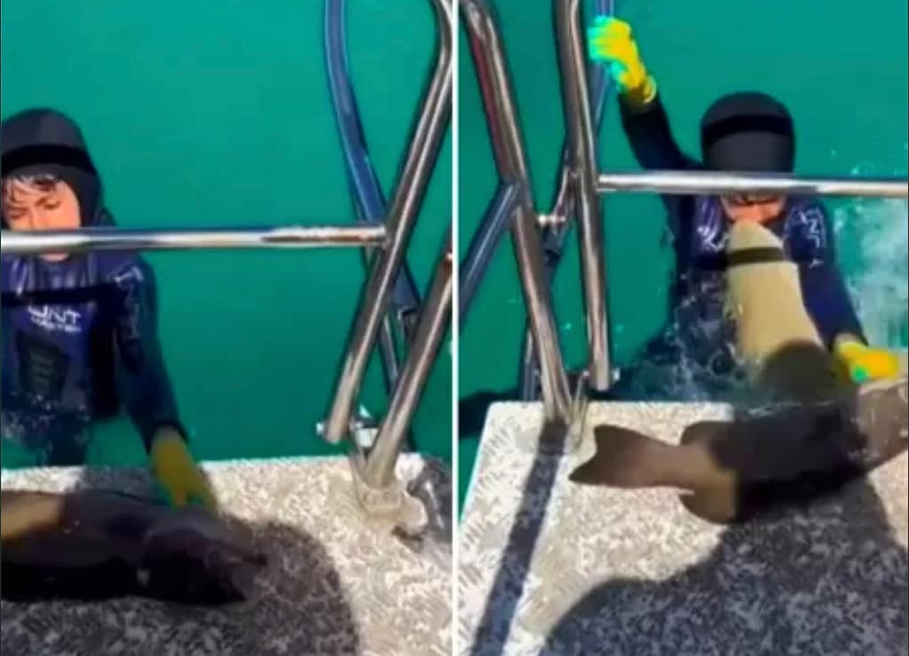 As imagens mostram Manni com roupa de mergulho, pendurado na lateral do barco e agarrando sua pesca, uma truta dos corais (Plectropomus leopardus), quando o tubarão surge e tenta abocanhar o animal capturado.