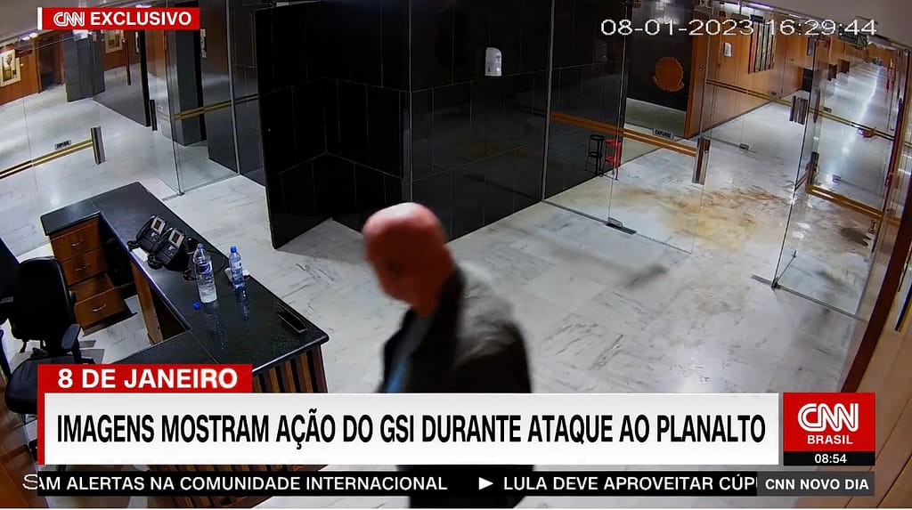 Minutos depois, o ministro aparece caminhando pelo mesmo corredor ao lado de bolsonaristas. As imagens sugerem que ele e outros integrantes do GSI indicam a saída de emergência ao grupo, diz a CNN.