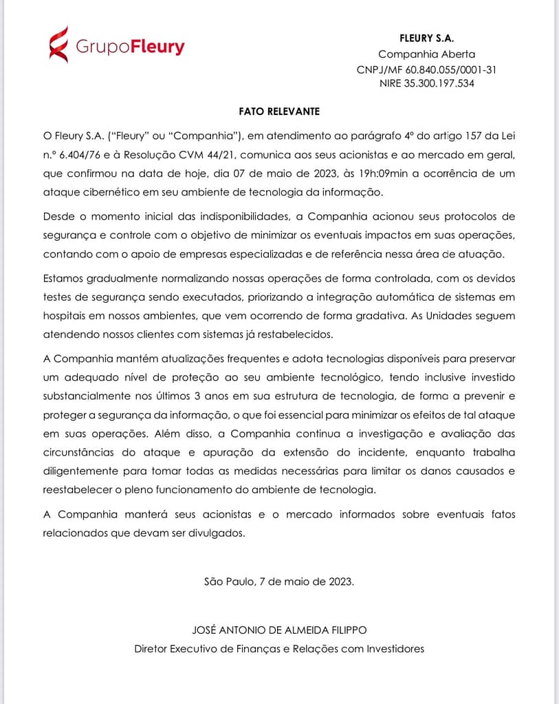 sexta-feira, o Instituto de Radiologia sofreu um ataque de hackers em seus sistemas, esse é o segundo ataque em menos de 3 anos. rumores que o criminoso é um hacker russo . pediu um resgate milionário em criptomoedas , para liberar o sistema. Não se sabe se foi pago . A previsão é que normalize ainda essa semana