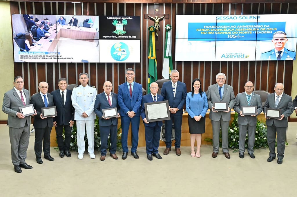 Em alusão aos 105 da Igreja Evangélica Assembleia de Deus no Rio Grande do Norte (IEADERN), o Legislativo potiguar realizou nesta segunda-feira (29) uma sessão solene para prestar homenagem ao aniversário de fundação da instituição, celebrado no último dia 24. De iniciativa do deputado Coronel Azevedo (PL), a solenidade reuniu parlamentares e evangélicos no plenário da Assembleia Legislativa.