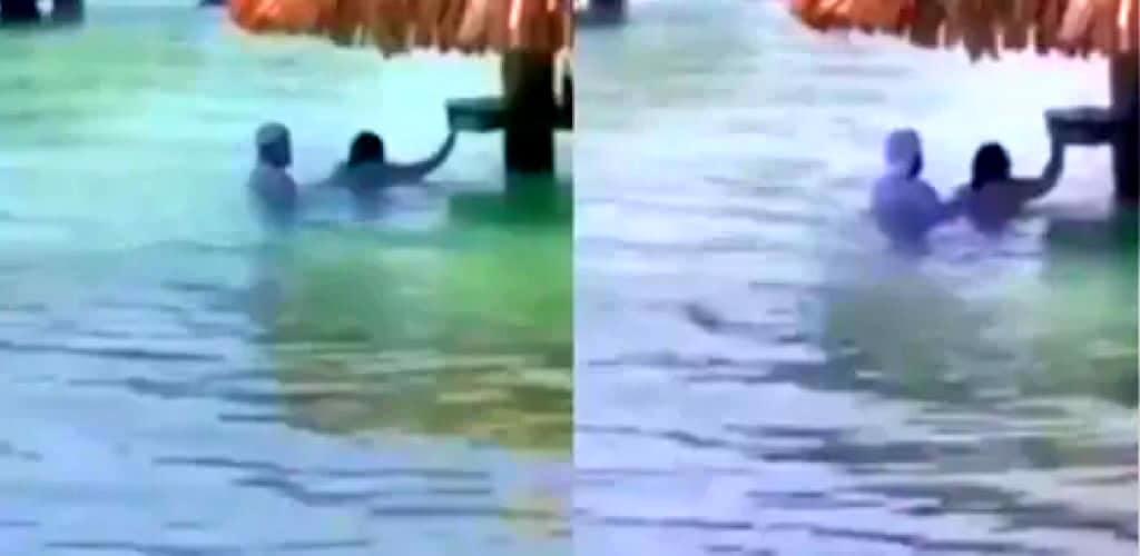 O vídeo do incidente na praia de Utila mostra o casal mais da metade na água, parecendo acreditar que está completamente coberto.