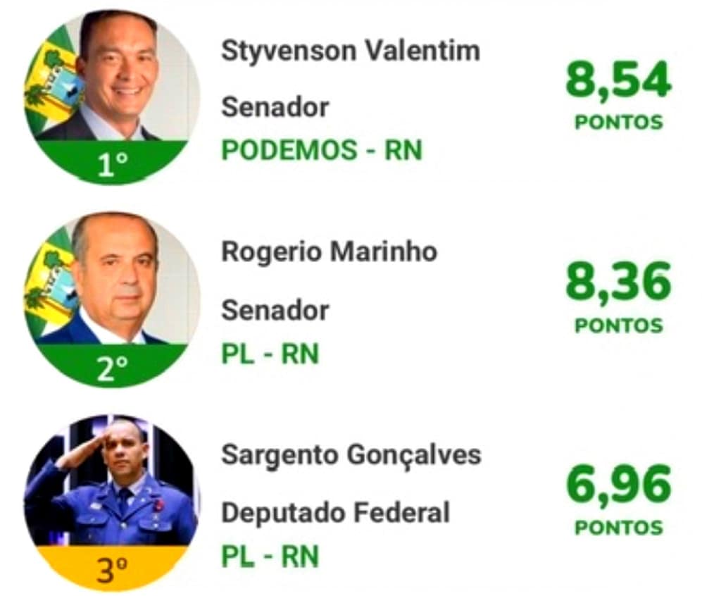 No Ranking dos Políticos, iniciativa da sociedade civil que avalia senadores e deputados federais em exercício, classificando-os do melhor para o pior, os senadores Styvenson Valentim (Podemos) e Rogério Marinho (PL) foram avaliados como os melhores parlamentares do Rio Grande no Congresso Nacional.