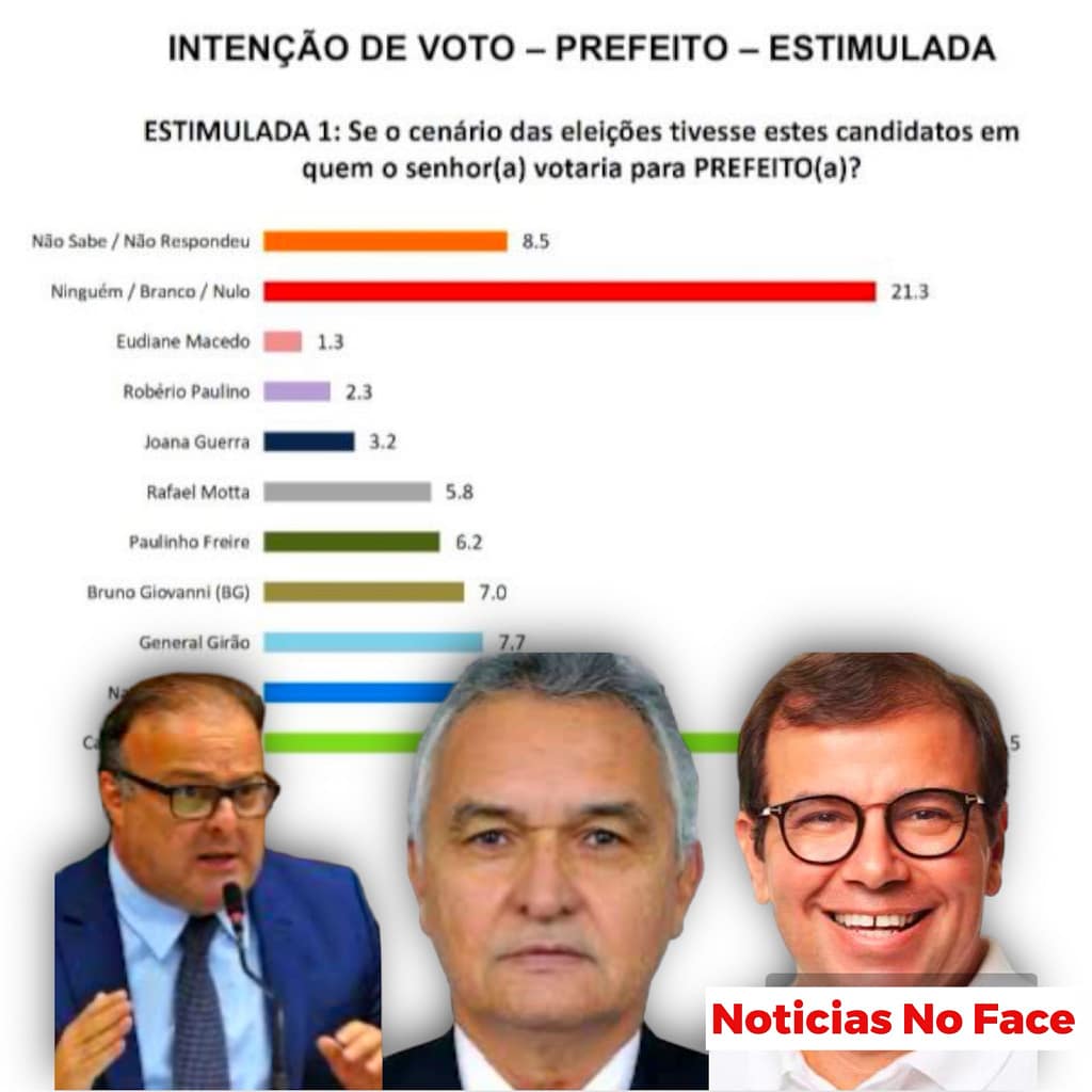 Em pesquisa estimulada, foi questionado aos entrevistados quem seria votado se o cenário do pleito eleitoral tivesse os seguintes candidatos: Carlos Eduardo (PSD), Natália Bonavides (PT), General Girão (PL), Bruno Giovanni (PSDB), Paulinho Freire (União Brasil), Rafael Motta (PSB), Joana Guerra, Robério Paulino (PSOL) e Eudiane Macedo (PV).
