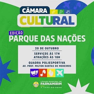 No dia 20 de outubro, sexta-feira, a Casa Legislativa vai realizar mais uma edição do Câmara Cultural, que desta vez vai levar muitas atrações aos moradores do bairro Parque das Nações. O evento terá início a partir das 17h, com uma feirinha de artesanato, seguido do show com diversas atrações de musicais, a partir das 18h. O local será na Quadra Poliesportiva da Av. Pref. Milton Dantas de Medeiros, ao lado da Farmácia Unifarma.