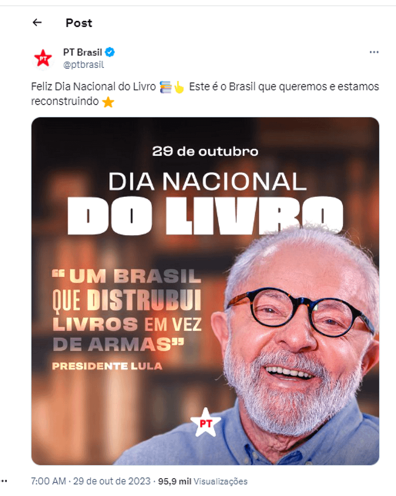 Na publicação, acompanhada da imagem do presidente Luiz Inácio Lula da Silva (PT), a postagem dizia: “Um Brasil que distribui livros em vez de armas”. No conteúdo, divulgado no perfil do PT, a fala com erro é atribuída a Lula.