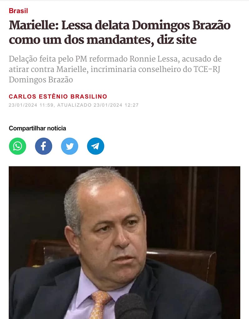 O ex-policial militar Ronnie Lessa, acusado de matar a ex-vereadora Marielle Franco e o motorista Anderson Gomes, delatou à Polícia Federal (PF) Domingos Brazão, atualmente conselheiro do Tribunal de Contas do Estado do Rio de Janeiro, como um dos mandantes de assassinar a ex-vereadora. A informação foi revelada ao Intercept Brasil por fontes ligadas à investigação.