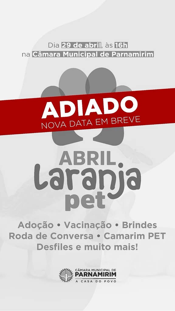 Em virtude das chuvas, a terceira edição do “Abril Laranja Pet” foi adiada. O evento seria realizado nesta segunda-feira, 29, em frente à Câmara de Parnamirim, com a participação de diversas entidades de proteção animal. Nova data será divulgada em breve.