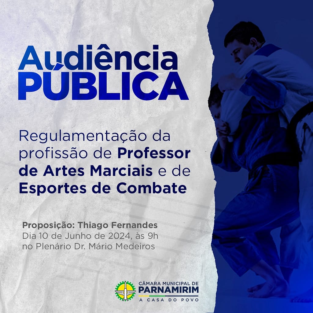 A Câmara Municipal de Parnamirim irá discutir, na próxima segunda-feira (10), a ‘Regulamentação da Profissão de Professor de Artes Marciais e de Esportes de Combate’. O evento será realizado no Plenário Dr. Mário Medeiros, às 9h, a pedido do vereador Thiago Fernandes.