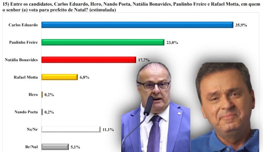 No cenário estimulado, em que os nomes dos candidatos são apresentados, o resultado apontou: Carlos Eduardo com 35,9%, seguido de Paulinho Freire 23%, Natália Bonavides 17,7%,Rafael Motta 6,8%, Heró e Nando Poeta 0,2%, já 11,1% não sabe e 5,1% branco ou nulo.