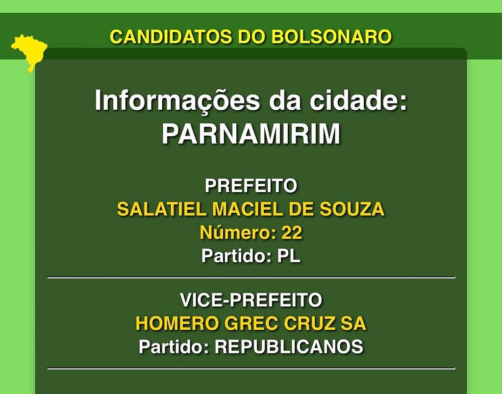 O ex-presidente Jair Bolsonaro (PL) lançou um site com a lista dos candidatos apoiados por ele nas eleições de 2024. O ex-chefe do Executivo tem candidatos espalhados por todo Brasil. Aqui no Rio Grande do Norte, na cidade de Parnamirim, a mais bolsonarista do Estado, Salatiel aparece na lista como o candidato a “Prefeito de Bolsonaro”.