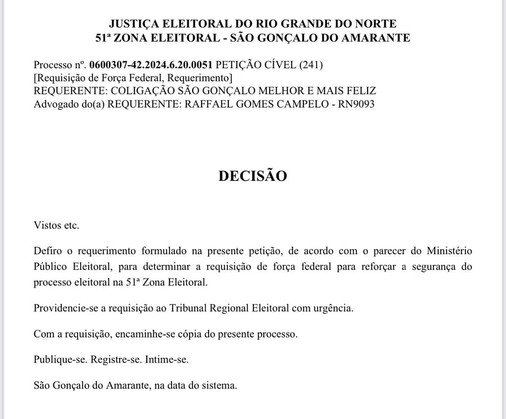 O juíz da 51ª Zona Eleitoral, Odinei Draeger, deferiu o pedido de tropas federais para reforçar a segurança pública durante as eleições deste ano em São Gonçalo do Amarante.