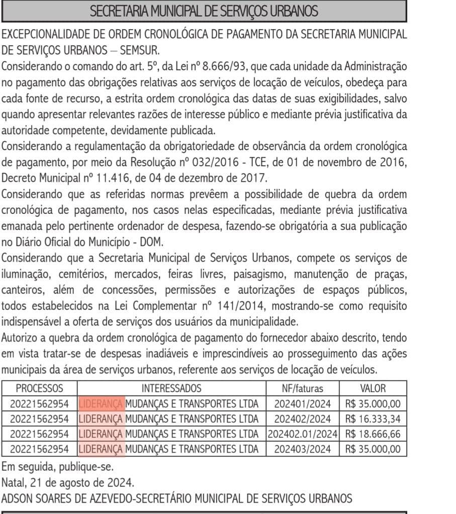 Para quem deveria ser punida, a empresa aparece como beneficiária de pagamentos antecipados. Na gestão pública, existe uma ordem de liquidação para os credores. Mas a Liderança consegue passar na frente e receber antes o seu, como se vê abaixo em contrato com a Semsur.