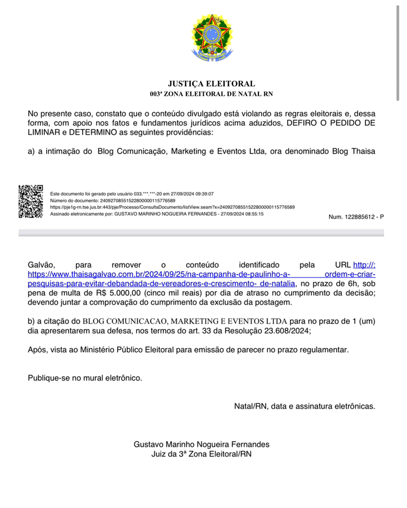 Além de considerar a postagem inverídica, a decisão judicial também questionou a responsabilidade da jornalista Thaisa Galvão, que mantém relações comerciais com o Governo do Estado, evidenciada pela presença de banners institucionais em seu blog. A coligação Bora Natal! argumentou que, por ser contratada pelo governo, Thaisa deveria ter ainda mais zelo e rigor na divulgação de informações, especialmente durante o período eleitoral, onde a disseminação de notícias falsas pode comprometer a legitimidade do processo.