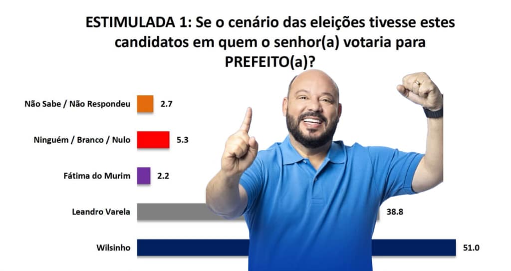 No cenário estimulado, Wilsinho tem 51% contra 38,8% de Leandro Varela e 2,2% de Fátima do Murim, já 5,3% branco ou nulo e 2,7% não respondeu.