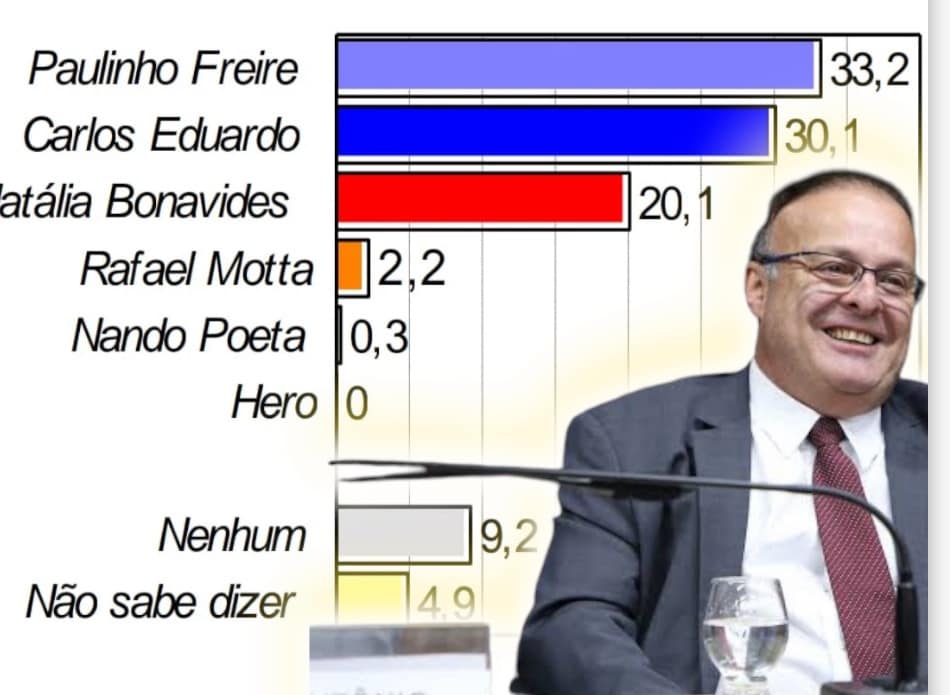 Caso as eleições fossem hoje, o deputado Paulinho Freire teria 33,20% dos votos dos natalenses, contra 30,10% do ex-prefeito Carlos Eduardo, segundo a sondagem estimulada, em que são apresentados os nomes dos seis candidatos ao pleito de 6 de outubro aos eleitores entrevistados.