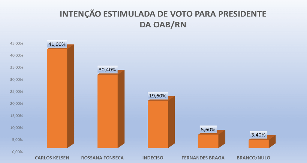 Na intenção estimulada para presidência da OAB-RN, Carlos Kelsen abre 11% de vantagem sobre Rossana Fonseca, com 41% contra 30,4%, já 19,6% indeciso, 5,6% Fernandes Braga e 3,4% branco ou nulo.