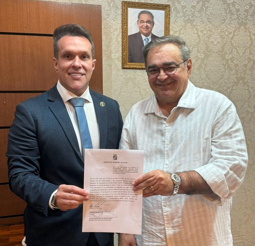 O presidente da Câmara Municipal de Natal, Eriko Jácome, assumiu interinamente o cargo de prefeito da capital potiguar nesta sexta-feira (22). A cerimônia de transmissão de cargo ocorreu no gabinete do prefeito, onde Álvaro Dias oficializou a transferência temporária de suas funções.