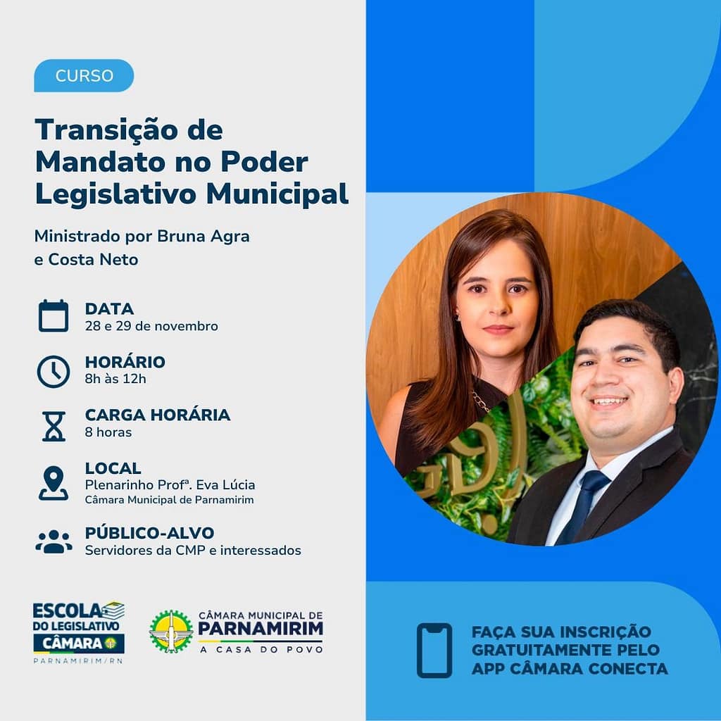 A Câmara Municipal de Parnamirim promove, nesta quinta (28) e sexta-feira (29/11), o Curso de Transição de Mandato. O propósito é promover capacitação para garantir a continuidade dos serviços essenciais e a transparência administrativa, no processo de mudança do comando político-administrativo após as eleições.
