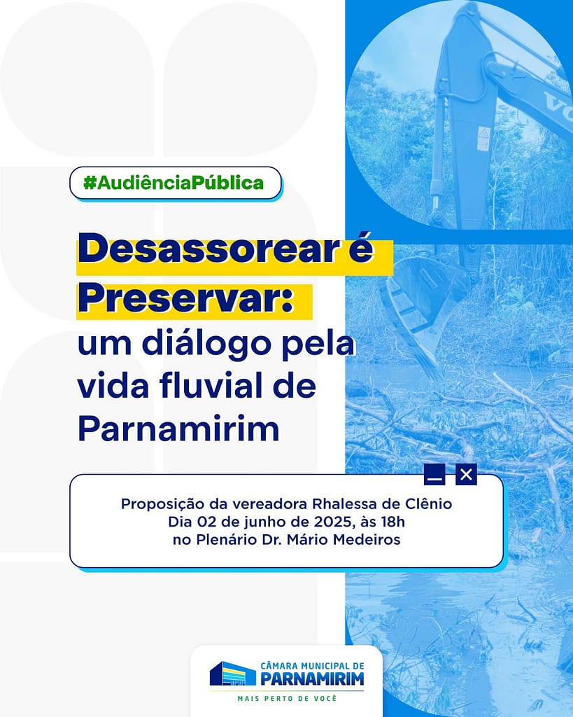 Nesta segunda-feira (02), a Câmara de Parnamirim realizará uma Audiência Pública para promover um diálogo sobre a “Vida Fluvial de Parnamirim”. A proposta é discutir os impactos do assoreamento e construir de forma conjunta um plano de ações voltado à preservação das bacias hidrográficas do município.