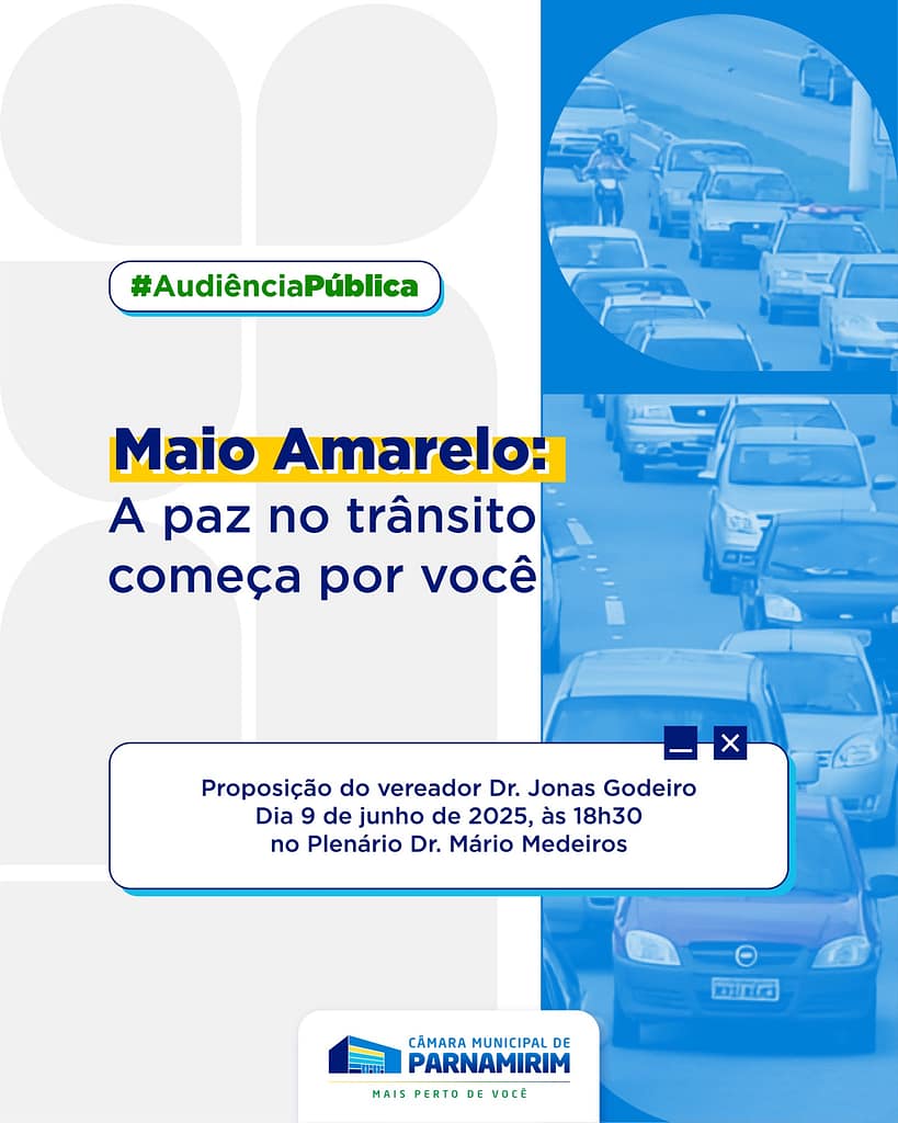 Em alusão à campanha Maio Amarelo, a Câmara Municipal de Parnamirim realiza, na próxima segunda-feira (9), às 18h30, uma Audiência Pública com o tema “A paz no trânsito começa por você”. A iniciativa, proposta pelo vereador Jonas Godeiro, acontece no Plenário Dr. Mário Medeiros e será aberta a toda população.
